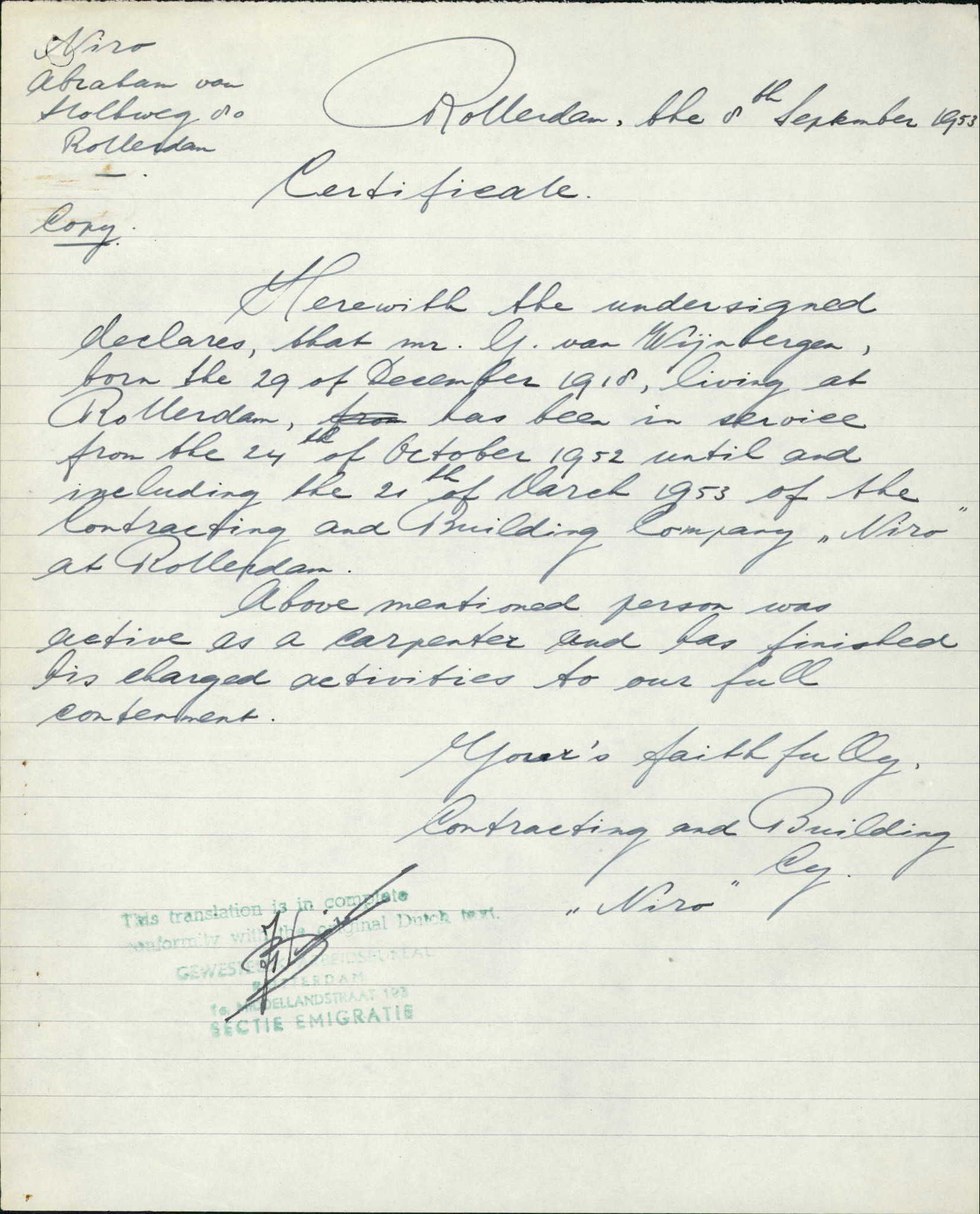 Employment Certificate for Mr. G. van Wijnbergen 1955
